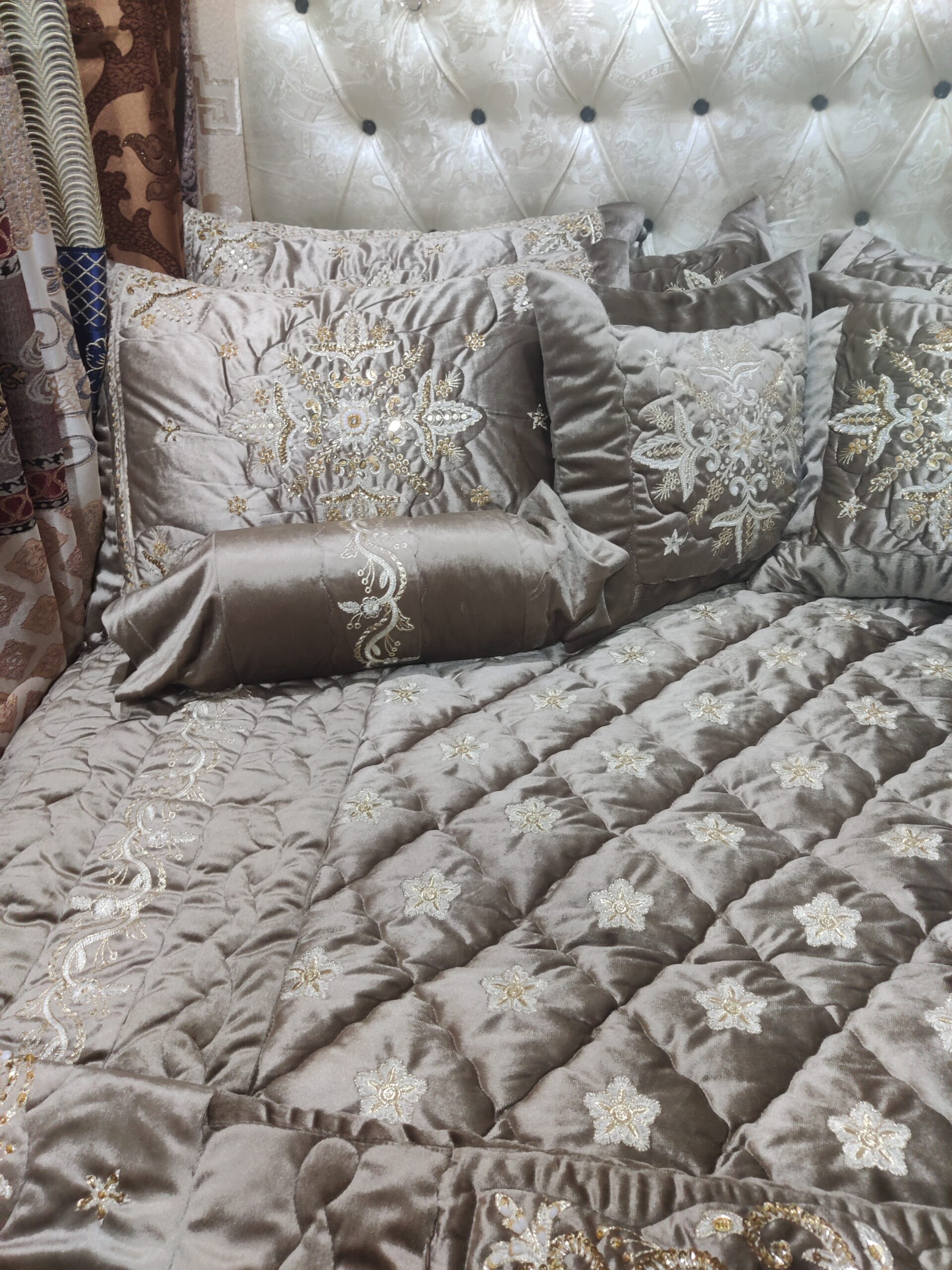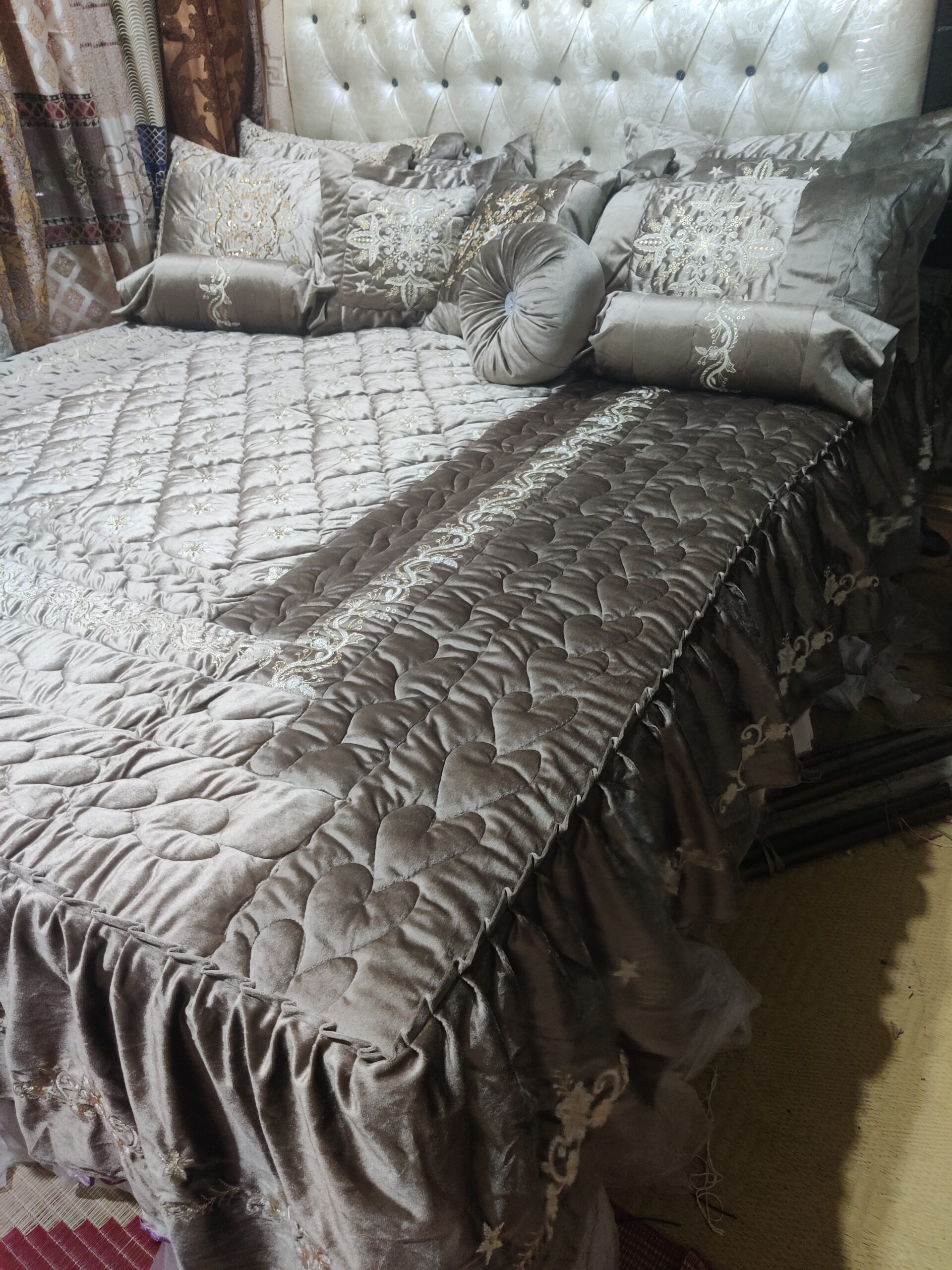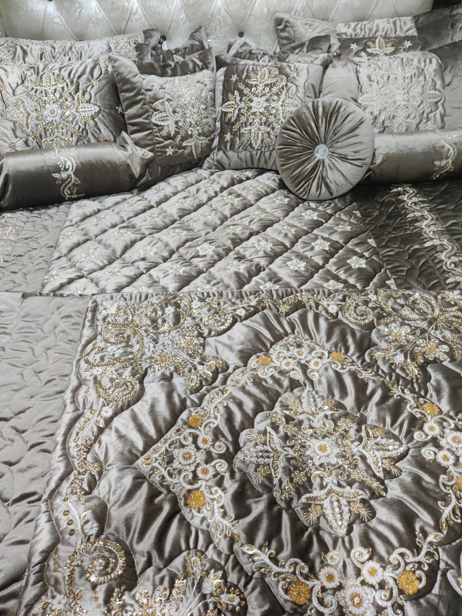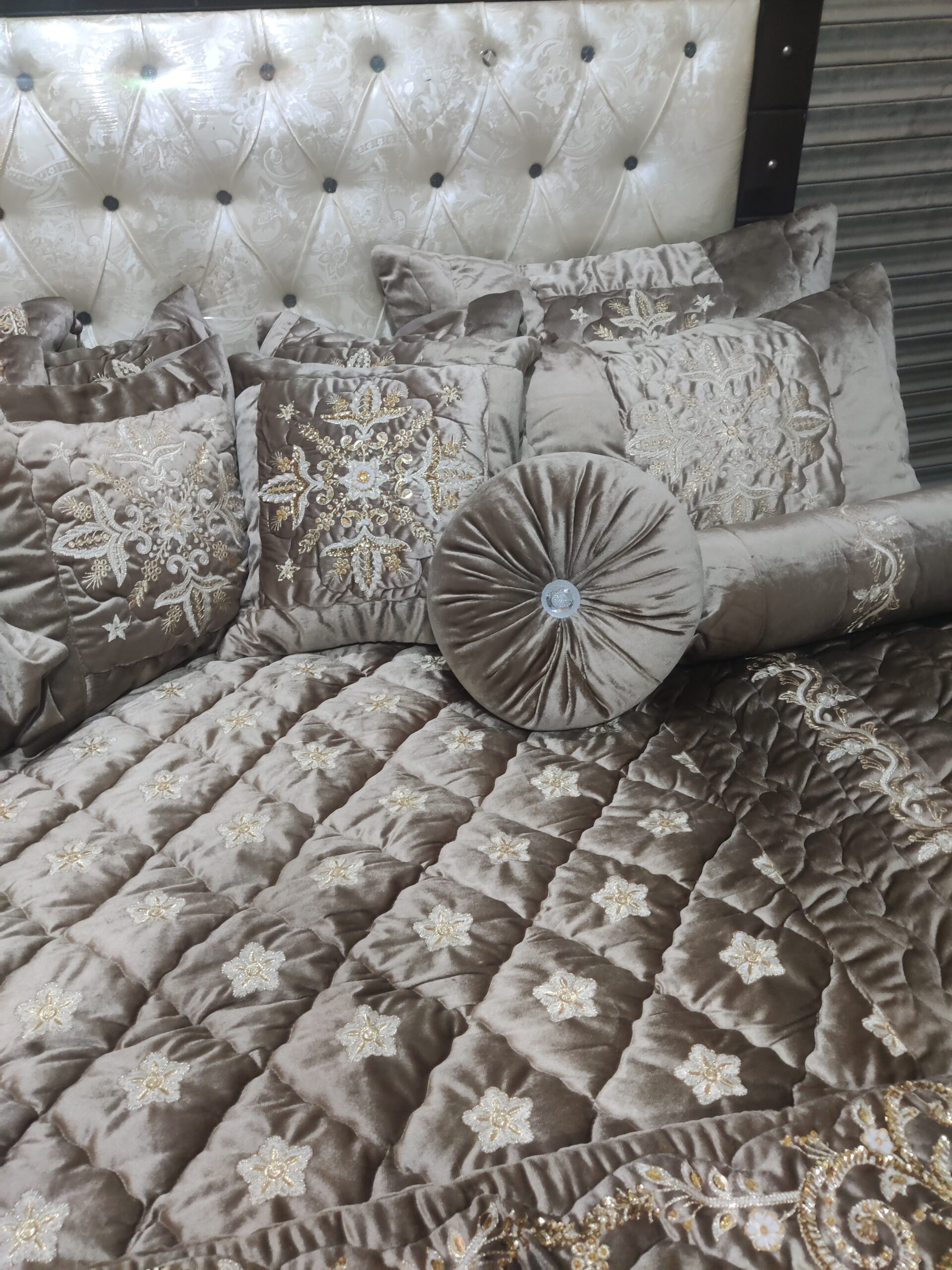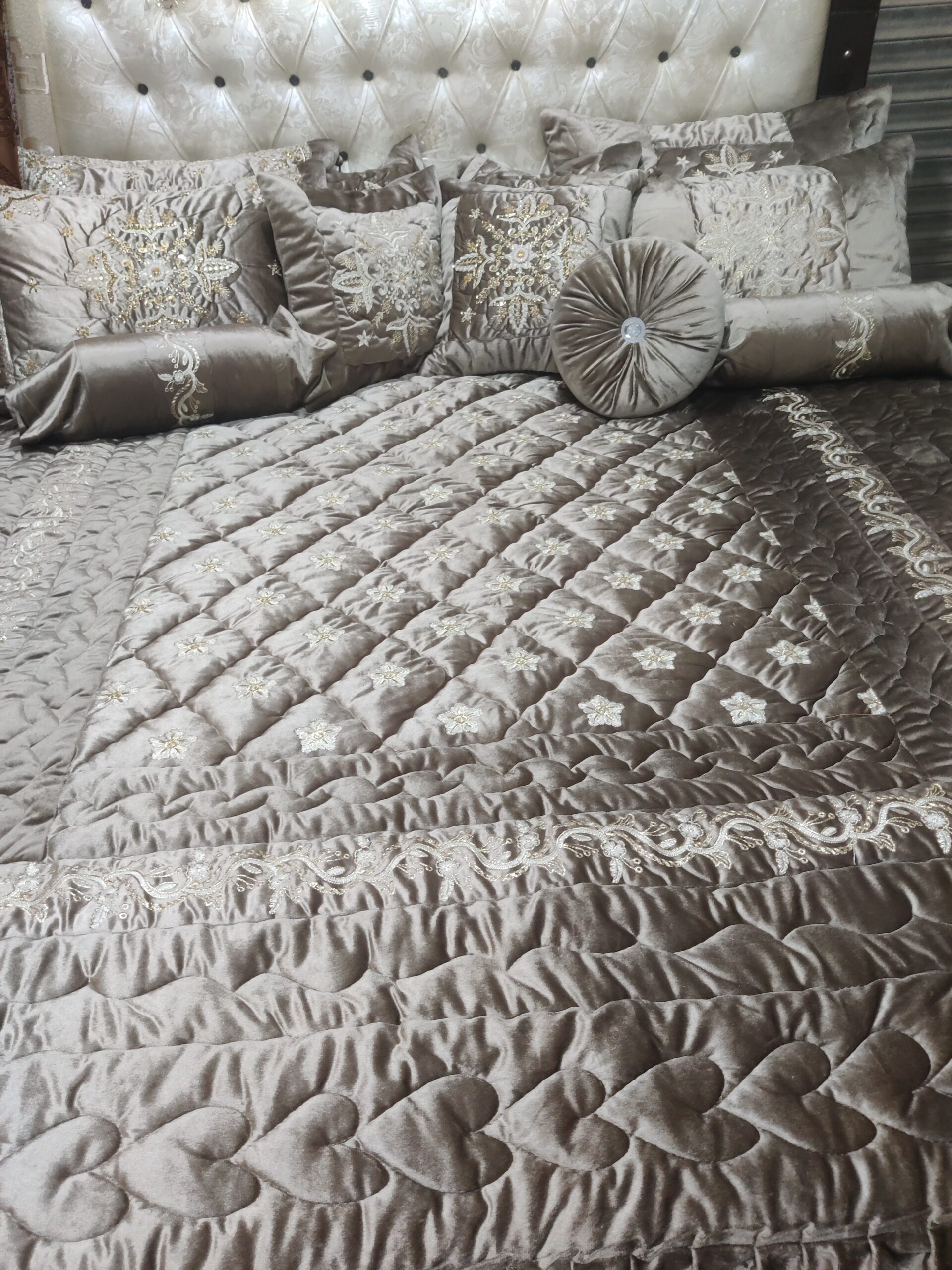 Luxury velvet comforter set with elegant cut dana embroidery, designed for bridal use, weddings, and jahez. Soft, rich fabric with a complete 9-piece set for a royal bedroom look.